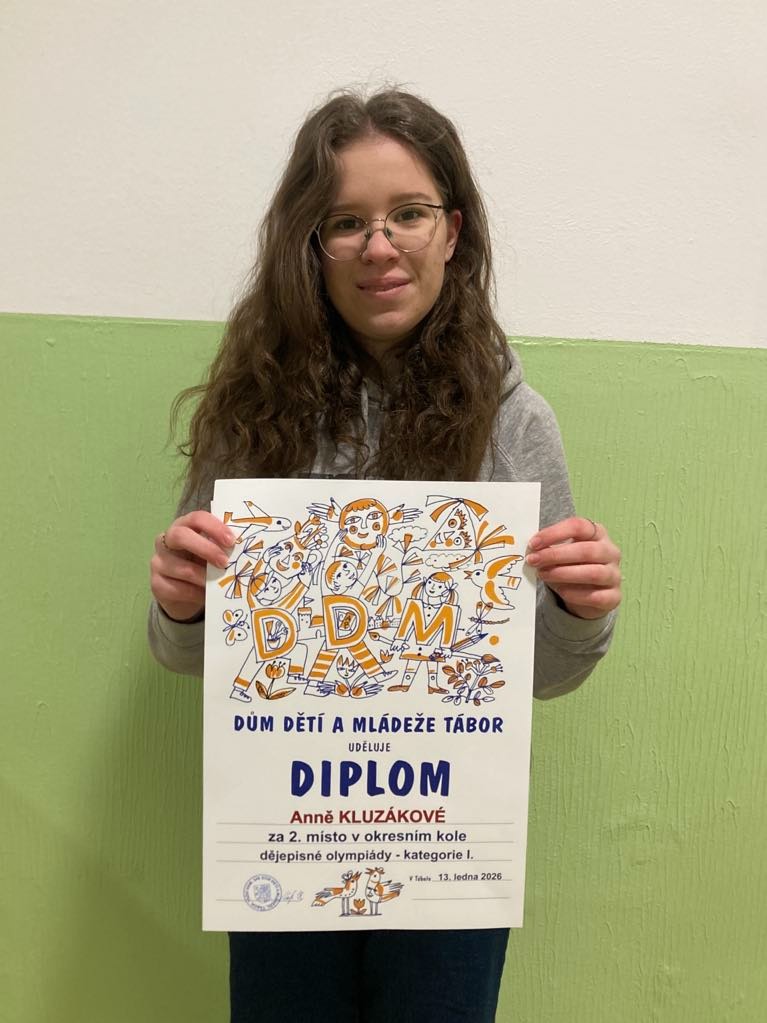 Velká gratulace patří žákyni naší koly Aničce Kluzákové z 9.D, která se umístila na 2.místě v okresním kole dějepisné olympiády. Přejeme hodně štěstí do krajského kola – držíme palce !!!